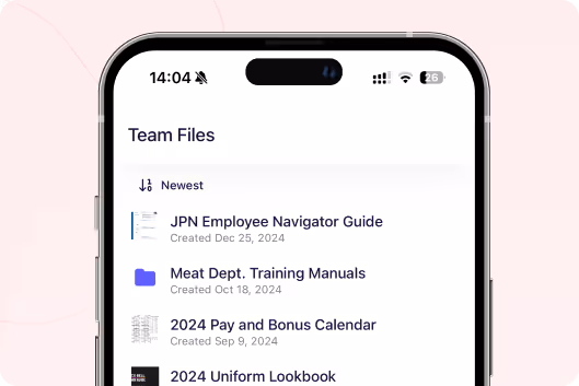 Employees tap Files section, see all documents. Watch training videos. Read the employee handbook. Check uniform policy. All from their phones. No desktop required. Perfect for frontline workers who don't sit at computers.