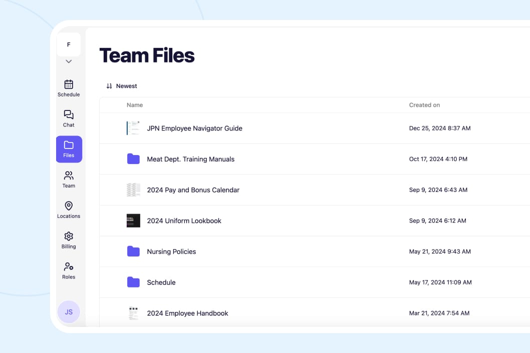 Files are currently in one list that everyone can access. You can name files clearly for easy identification (e.g., "2024 Employee Handbook" or "Uniform Policy Updated Nov 2024"). Team can search for files by name.