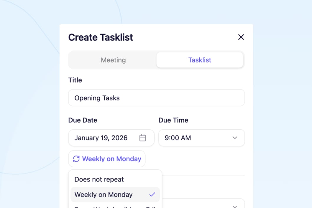 Create recurring tasks. Temperature checks every Wednesday. Clean fryers every Sunday. Opening checklist daily. Set it once, repeats automatically.
